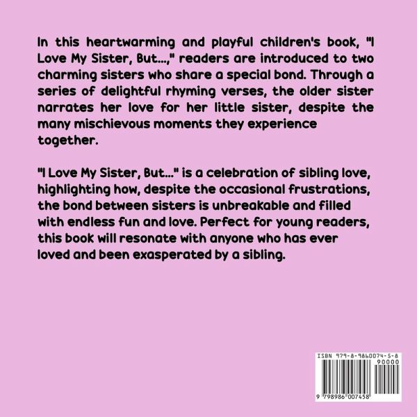 In this heartwarming and playful children's book, "I Love My Sister, but.." readers are introduced to two charming sisters who share a special bond. Through a series of delightful rhyming verses, the older sister narrates her for her little sister, despite the many mischievous moments they experience together.