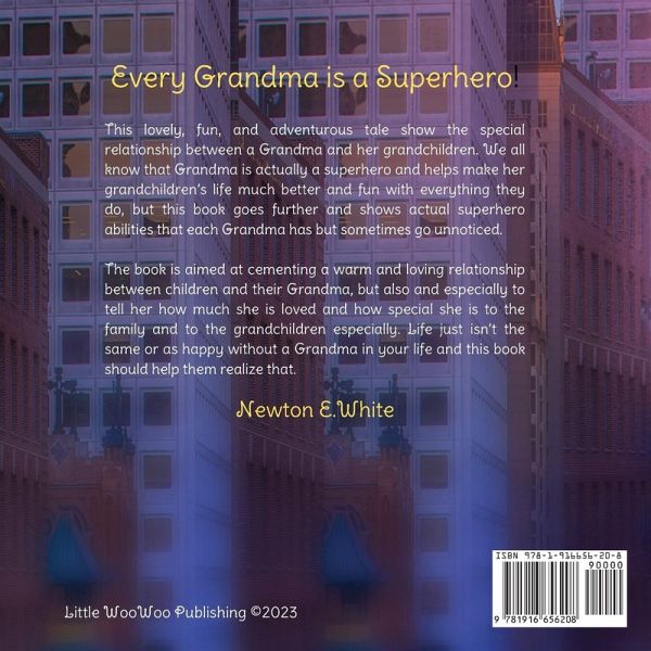 This lovely, fun, and adventurous tale show the special relationship between a Grandma and her grandchildren. We all know that Grandma is actually a superhero and helps make her grandchildren's life much better and fun with everything they do, but this book goes further and shows actual superhero abilities that each Grandma has but sometimes go unnoticed. This book contains a rhyming adventure of everyday situations between children and their Grandma, which can be interpreted as having real superpowers, especially for young children. These 'perceived' or 'real' powers described in the book include but are not limited to,Super strength, Growth abilities, Super senses, X-ray eyes, Animal senses, and a Magical broom! The book is aimed at cementing a warm and loving relationship between children and their Grandma, but also and especially to tell her how much she is loved and how special she is to the family and to the grandchildren especially. Life just isn't the same or as happy without a Grandma in your life and this book should help them realize that and make a perfect gift.