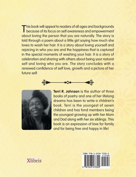 This book will appeal to readers of all ages and backgrounds because of its focus on self awareness and empowerment about loving the person that you are naturally. The story is told through a poem about a little girl saying how much she loves to wash her hair. It is a story about loving yourself and rejoicing in who you are and the happiness that is captured in the special moments of washing your hair. It is a story of celebration and sharing with others about being your natural self and loving who you are. The story concludes with a renewed confidence of self love, growth and a picture of her future self.