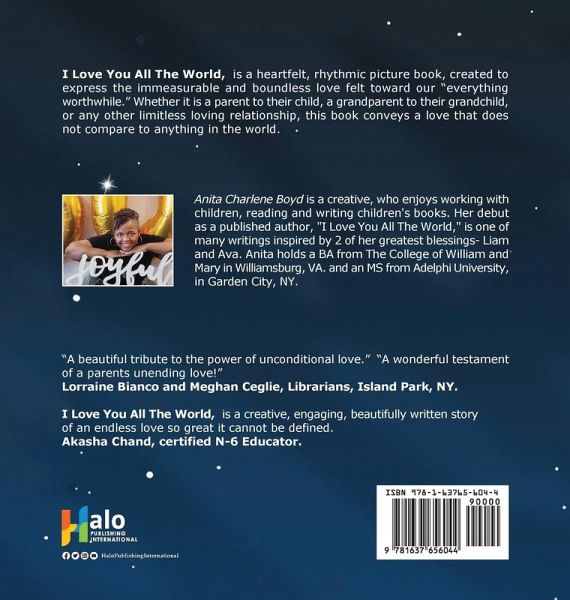 I Love You All The World, is a heartfelt, rhythmic picture book, created to express the immeasurable and boundless love felt toward our "everything worthwhile." Whether it is a parent to their child, a grandparent to their grandchild, or any other limitless loving relationship, this book conveys a love that does not compare to anything in the world.