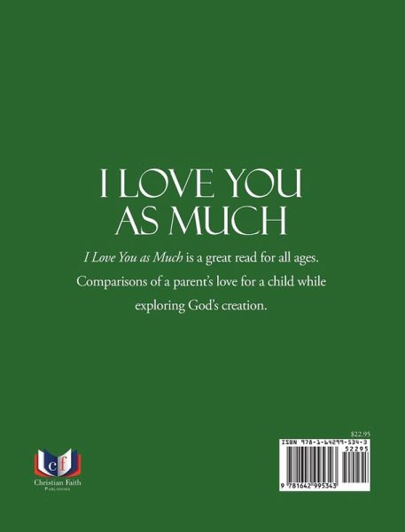 I Love You as Much is a great read for children of all ages. Inside the comparisons of a parent's love for a child while exploring God's creation are sure to delight, while the gorgeous illustrations enchant and mesmerize.