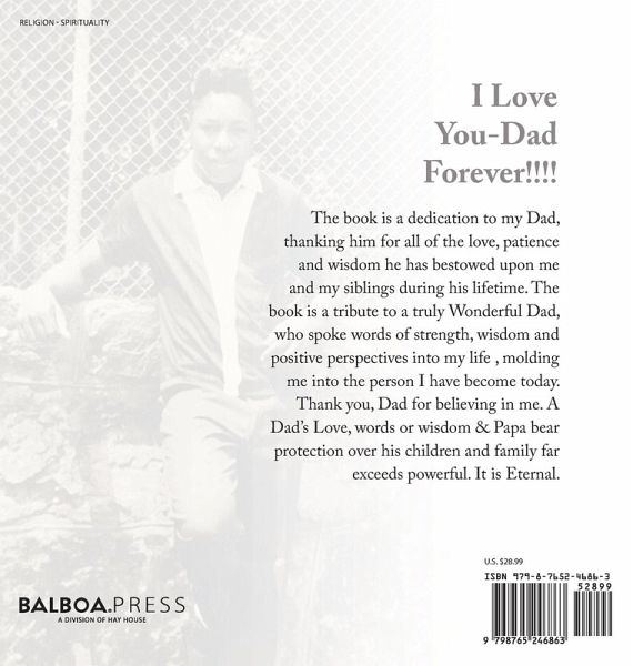 The book is a dedication to my Dad, thanking him for all of the love, patience and wisdom he has bestowed upon me and my siblings during his lifetime. The book is a tribute to a truly Wonderful Dad, who spoke words of strength, wisdom and positive perspectives into my life , molding me into the person I have become today. Thank you, Dad for believing in me. A Dad's Love, words or wisdom & Papa bear protection over his children and family far exceeds powerful. It is Eternal.