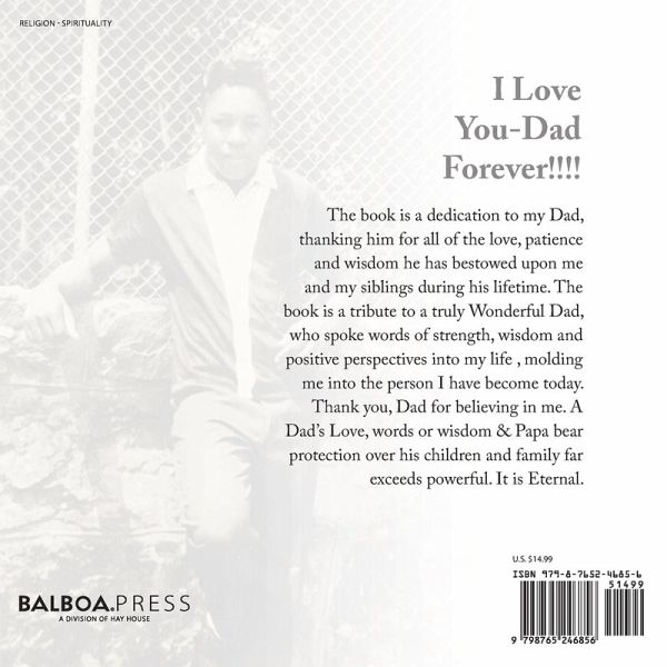 The book is a dedication to my Dad, thanking him for all of the love, patience and wisdom he has bestowed upon me and my siblings during his lifetime. The book is a tribute to a truly Wonderful Dad, who spoke words of strength, wisdom and positive perspectives into my life , molding me into the person I have become today. Thank you, Dad for believing in me. A Dad's Love, words or wisdom & Papa bear protection over his children and family far exceeds powerful. It is Eternal.