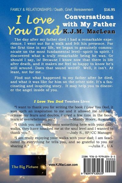 The day after my father died I had a remarkable experience. I went out for a walk and felt his presence. For the first time in my life, we began to genuinely communicate on the most fundamental level-spirit to spirit. I discovered what a truly remarkable being he was. Or should I say, is! Because I know now that there is life after death, and it makes me feel so happy to know he's still around. Does that sound weird? Well, it isn't. At least, not for me... Find out what happened to my father after he died, and what it was like for him on the other side. It's a fascinating and inspiring story. It may help you to discover the angel inside of you. I Love You Dad Touches Lives "I want to thank you for writing the book I Love You Dad, it was such an inspiration to me and it allowed me to easily release my fears and doubts. I cried a few time in the book, tears of overwhelming joy." -Mandy Moore, Australia "I think you are really onto something here with your daily walks, they have touched me at the soul level and I wanted to thank you." -Jody S., SP/CC Manager "I am really enjoying your walks with your dad; I am fascinated by everything he tells you, and so grateful to you for sharing it." -Julia F., U.K