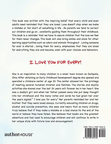 This book was written with the inspiring belief that every child and even adults need reminded that they are loved. Love doesn't stop when we make a mistake or fall short of something in life . As parents we tend to correct our children and go on , constantly guiding them throughout their childhood. This book is a reminder that we have to assure children that the love we feel for them never changes. This book will also bring smiles and allow for other learning opportunities such as colors and animals throughout . Loving someone for ever is eternal , loving them for every, emphasizes that they are loved for everything they are and become, even with poor choices and behaviors.