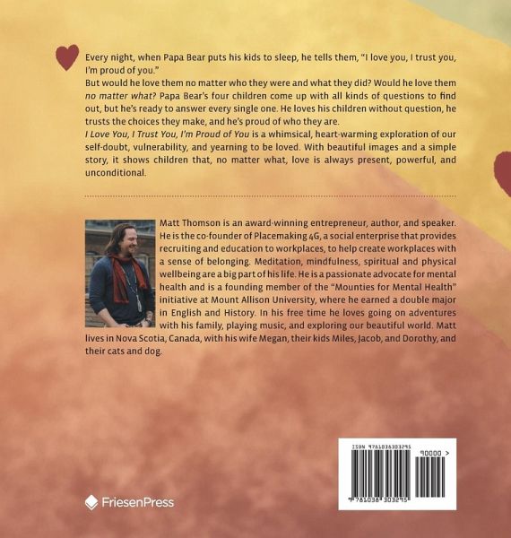 Every night, when Papa Bear puts his kids to sleep, he tells them, "I love you, I trust you, I'm proud of you." But would he love them no matter who they were and what they did? Would he love them no matter what? Papa Bear's four children come up with all kinds of questions to find out, but he's ready to answer every single one. He loves his children without question, he trusts the choices they make, and he's proud of who they are. I Love You, I Trust You, I'm Proud of You is a whimsical, heart-warming exploration of our self-doubt, vulnerability, and yearning to be loved. With beautiful images and a simple story, it shows children that, no matter what, love is always present, powerful, and unconditional.