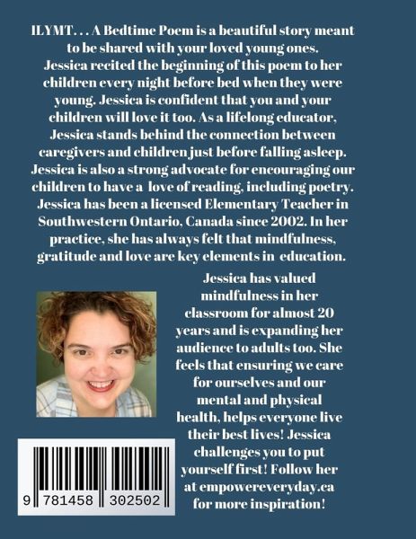 ILYMT. . . A Bedtime Poem is a beautiful story meant to be shared with your loved young ones. Jessica recited the beginning of this poem to her children every night before bed when they were young. Jessica is confident that you and your children will love it too. As a lifelong educator, Jessica stands behind the connection between caregivers and children just before falling asleep. Jessica is also a strong advocate for encouraging our children to have a love of reading, including poetry.