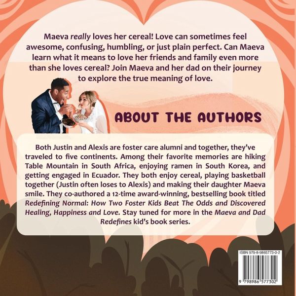 This debut kid's book of the Maeva and Dad Redefine series titled, I Love You More Than Cereal follows Maeva and Dad as they explore the true meaning of love and the amazing impact it can have on all of us if we take the time to redefine it. Maeva really loves her cereal! Love can sometimes feel awesome, confusing, humbling, or just plain perfect. Can Maeva learn what it means to love her friends and family even more than she loves cereal? Join Maeva and her dad on their journey to explore the true meaning of love. Breaking down principles in the original twelve-time, award-winning bestselling book Redefining Normal: How Two Foster Kids Beat The Odds and Discovered Healing, Happiness and Love for younger audiences, this book celebrates healthy love, family, community, parenthood, and the value of Black fathers. With vibrant illustrations and lovable characters, this book is sure to be a child's favorite and enjoyed alongside family and friends with their favorite bowl of cereal! It will be enjoyed by children who love a good snack while exploring ideas of love, compassion and empathy. Who do you love more than cereal? Features a "To" and "From" personalization page, making this sweet offering an ideal gift for baby showers, holidays, birthdays, and more!