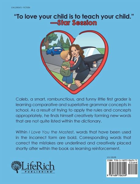 "To love your child is to teach your child." -Star Session Caleb, a smart, rambunctious, and funny little first grader is learning comparative and superlative grammar concepts in school. As a result of trying to apply the rules and concepts appropriately, he finds himself creatively forming new words that are not quite listed within the dictionary. Within I Love You the Mostest, words that have been used in the incorrect form are bold. Corresponding words that correct the mistakes are underlined and creatively placed shortly after within the book as learning reinforcement.