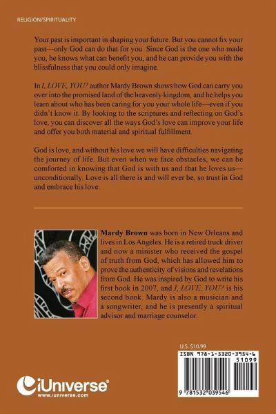 Your past is important in shaping your future. But you cannot fix your pastonly God can do that for you. Since God is the one who made you, he knows what can benefit you, and he can provide you with the blissfulness that you could only imagine. In I, LOVE, YOU? author Mardy Brown shows how God can carry you over into the promised land of the heavenly kingdom, and he helps you learn about who has been caring for you your whole lifeeven if you didnt know it. By looking to the scriptures and reflecting on Gods love, you can discover all the ways Gods love can improve your life and offer you both material and spiritual fulfillment. God is love, and without his love we will have difficulties navigating the journey of life. But even when we face obstacles, we can be comforted in knowing that God is with us and that he loves usunconditionally. Love is all there is and will ever be, so trust in God and embrace his love.