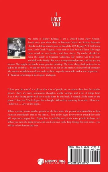 My name is Johnny Estrada, I am a United States Navy Veteran. Served one- year shore duty at Pensacola Naval Air Station Pensacola Florida, and three seasick years on board the USS Papago ATF-160 home port, Little Creek Virginia. I was born in San Antonio Texas. My single mom raised me, one brother, and three sisters. My mother decided to move the family to Southern California. My mother was both mom and dad to the family. She was a strong-minded person, and she was my mentor. She taught the family about positive thinking. My mom always had projects for us kids to do and thus... we did not have time to be out on the streets with maybe bad company. My mother would always tell me to do my best, to go the extra mile, and m¬ore important... if I failed at something, to do it again, and again. "I love you this much" is a phrase that a lot of people use to express their love for another person. There are many sentimental thoughts, words, feelings, and a lot of things from A to Z that loving people will say to each other. In this book, I expand a little more on the phrase "I love you." Each chapter has a thought, followed by repeating the words...I love you. I believe in... Love at first sight... When a person meets another person for the first time, the person feels butterflies in their stomach immediately, then to me that is... love at first sight. Every person around the world will experience puppy love. Puppy love is probably one of the most painful feelings ever. When you meet the right person, and you both have really deep feelings for each other...you will be in love forever and ever.
