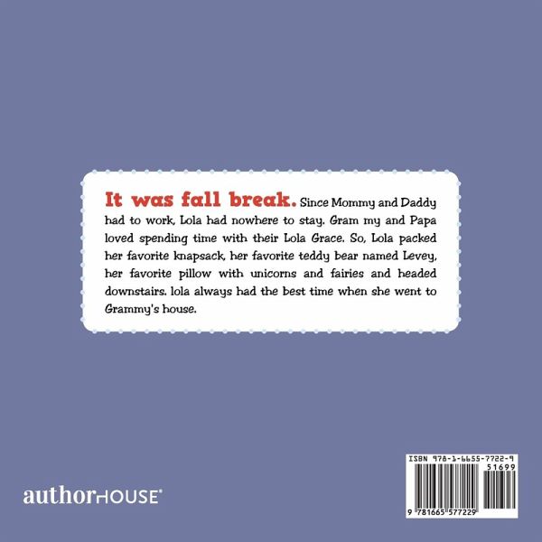 It was fall break. Since Mommy and Daddy had to work, Lola had nowhere to stay. Gram my and Papa loved spending time with their Lola Grace. So, Lola packed her favorite knapsack, her favorite teddy bear named Levey, her favorite pillow with unicorns and fairies and headed downstairs. lola always had the best time when she went to Grammy's house.