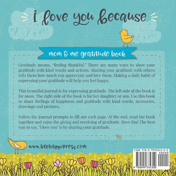 Gratitude means, "feeling thankful." There are many ways to show your gratitude with kind words and actions. Sharing your gratitude with others tells them how much you appreciate and love them. Making a daily habit of expressing your gratitude will help you feel happy. This beautiful journal is for expressing gratitude. The left side of the book is for mom. The right side of the book is for her daughter or son. Use this book to share feelings of happiness and gratitude with kind words, memories, drawings and pictures. Follow the journal prompts to fill out each page. At the end, read the book together and enjoy the giving and receiving of gratitude. Have fun! The best way to say, "I love you" is by sharing your gratitude.