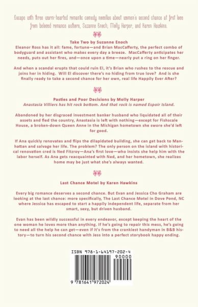 Escape with three warm-hearted romantic comedy novellas about women's second chance at first love from beloved romance authors, Suzanne Enoch, Molly Harper, and Karen Hawkins. Take Two by Suzanne Enoch Eleanor Ross has it all: fame, fortune-and Brian MacCafferty, the perfect combo of bodyguard and assistant who makes every day a breeze. MacCafferty anticipates her needs, puts out her fires, and-once upon a time-nearly put a ring on her finger. And when a scandal erupts that could ruin El, it's Brian who rushes to the rescue and joins her in hiding. Will El discover there's no hiding from true love? And is she finally ready to take a second chance for her own, real life Happily Ever After? Pasties and Poor Decisions by Molly Harper Anastasia Villiers has hit rock bottom. And that rock is named Espoir Island. Abandoned by her disgraced investment banker husband who liquidated all of their assets and fled the country, Anastasia is left with nothing-except for Fishscale House, a broken-down Queen Anne in the Michigan hometown she swore she'd left for good. If Ana quickly renovates and flips the dilapidated building, she can get back to Manhattan and salvage her life. The problem? The only person on the island with historical renovation cred is Ned Fitzroy-Ana's first love-who insists she help him with the labor herself. As Ana gets reacquainted with Ned, and her hometown, she realizes home may be just what she's always wanted. Last Chance Motel by Karen Hawkins Every big romance deserves a second chance. But Evan and Jessica Cho Graham are looking at the last chance: more specifically, The Last Chance Motel in Dove Pond, NC where Jessica has escaped to start a happily independent life, separate from her smart, sexy, but driven husband. Evan has been wildly successful in every endeavor, except keeping the heart of the one woman he loves more than anything. If he's going to repair this mess, he's going to need all the help he can get-even if it's from the crankiest handyman in B&B history-to turn his second chance with Jess into a perfect storybook happy ending.