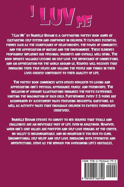 "I Luv Me" by Danielle Brown is a captivating poetry book aimed at cultivating self-esteem and confidence in children. It explores essential themes such as the significance of relationships, the power of community, and the appreciation of nature and the environment. These elements profoundly influence our personal journeys and overall well-being. The book imparts valuable lessons on self-love, the importance of connections, and an appreciation for the world around us. Readers will discover that embracing their true selves and valuing the people and things in their lives greatly contribute to their quality of life. The poetry book commences with verses dedicated to loving and appreciating one's physical appearance, family, and friendships. The inclusion of vibrant illustrations enhances the poetic experience, igniting the imagination of each child. Furthermore, every 2-3 poems are accompanied by assessment pages featuring insightful questions, as well as activity pages that encourage children to express themselves creatively. Danielle Brown strives to convey to her readers that trials and challenges are an inevitable part of life, even in adulthood. However, when one's core values are fortified and self-love remains at the center, no valley is insurmountable, and no mountain is too high to climb. Unconditional self-belief and self-love, embracing both strengths and imperfections, serve as the bedrock for overcoming life's obstacles.