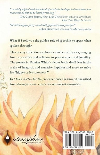 "...a wholly original work that asks all of us to look a bit deeper inside ourselves, and to excavate all that we've buried for too long." - Dr. Clint Smith, New York Times best-selling author of How The Word Is Passed "It's like language poetry crossed with gospel: extremely powerful." - Dan Gutstein, author of Metacarpalism --- What if I told you the golden rule of speech is to speak when spoken through? This poetry collection explores a number of themes, ranging from spirituality and religion to perseverance and humility. The poems in Damian White's debut book dwell less in the realm of imagistic and narrative impulses and more so strive for "higher order statement." In I Made A Place For You, we experience the turmoil unearthed from daring to make a place for our inmost curiosities.