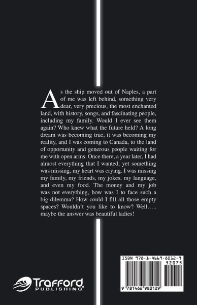 As the ship moved out of Naples, a part of me was left behind, something very dear, very precious, the most enchanted land, with history, songs, and fascinating people, including my family. Would I ever see them again? Who knew what the future held? A long dream was becoming true; it was becoming my reality, and I was coming to Canada, to the land of opportunity and generous people waiting for me with open arms. Once there, a year later, I had almost everything that I wanted, yet something was missing; my heart was crying. I was missing my family, my friends, my jokes, my language, and even my food. The money and my job was not everything. How was I to face such a big dilemma? How could I fill all those empty spaces? Wouldn't you like to know? Well, maybe the answer was beautiful ladies!