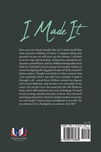 Have you ever asked yourself, why me? I asked myself that same question millions of times. I stopped asking that question because we will never get the answers. I decided to survive rape, physical abuse, verbal abuse, abandonment, rejection, unworthiness, and my childhood being taken away from me. I decided I am not going to be another statistic to society by fighting the big giant! In spite of all the turmoil I had to endure, I fought even harder to show everyone that I am somebody when I was told I was a nobody. I made it through it all-raised three children, earned two degrees and several diplomas, and became very successful in my career. You can do it too. You must have the will. Read my story, and it will transform your way of thinking. No need to turn to drugs, alcohol, abortion, or abuse. You can touch and change many lives. Don't be another statistic to society; be a role model. I want to leave a handprint in your life. Do you want to leave a handprint on someone else's life?