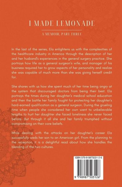 In the last of the series, Ela enlightens us with the complexities of the healthcare industry in America through the description of her and her husband's experiences in the general surgery practice. She portrays how life as a general surgeon's wife, and manager of his business required her to grow aspects of her personality and realize she was capable of much more than she was giving herself credit for. She shares with us how she spent much of her time being angry at the system that discouraged doctors from being their best. Ela portrays the times during her daughter's medical school education and then the battle her family fought for protecting her daughter's hard-earned qualification as a general surgeon. During the grueling time when people she considered her own went to unbelievable lengths to hurt her daughter she faced loneliness she never faced before. But through it all she and her family triumphed without compromising on their core beliefs. While dealing with the attacks on her daughter's career Ela successfully weds her son to an American girl. From the planning to the reception, it is a delightful read about how she handles the blending of the two cultures.