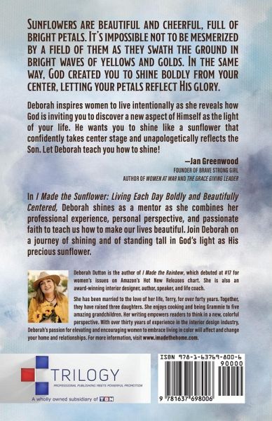 SUNFLOWERS ARE BEAUTIFUL AND CHEERFUL, FULL OF BRIGHT PETALS. IT'S IMPOSSIBLE NOT TO BE MESMERIZED BY A FIELD OF THEM AS THEY SWATH THE GROUND IN BRIGHT WAVES OF YELLOWS AND GOLDS. IN THE SAME WAY, GOD CREATED YOU TO SHINE BOLDLY FROM YOUR CENTER, LETTING YOUR PETALS REFLECT HIS GLORY. Deborah inspires women to live intentionally as she reveals how God is inviting you to discover a new aspect of Himself as the light of your life. He wants you to shine like a sunflower that confidently takes center stage and unapologetically reflects the Son. Let Deborah teach you how to shine! Jan Greenwood Founder of Brave Strong Girl Author of Women at War and The Grace Giving Leader In I Made the Sunflower: Living Each Day Boldly and Beautifully Centered, Deborah shines as a mentor as she combines her professional experience, personal perspective, and passionate faith to teach us how to make our lives beautiful. Join Deborah on a journey of shining and of standing tall in God's light as His precious sunflower.