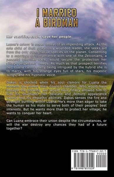 Her sacrifice could save her people. Luana's colony is under threat of an impending attack. As the sole child of their grievously wounded leader, she seeks aid from the only other native species on the planet. Consenting to a marriage of convenience with one of the Zelconians, a peaceful bird-like race, would secure the protection her village desperately needs. As much as that prospect terrifies her, Luana cannot deny being intrigued by the hybrid she is to marry, with his strange eyes full of stars, his majestic wings, and his hypnotic voice. Dakas is shocked when his soul clamors for Luana the moment she enters their Council chamber. Who would have thought the brewing war would have finally allowed him to find his soulmate? Her delicate and demure appearance cannot fool his empathic abilities. Dakas senses the fire and strength burning within Luana. He's more than eager to take the human as his mate to serve both of their peoples' best interests. But he wants more than to protect her village; he wants to conquer her heart. Can Luana embrace their union despite the circumstances, or will the war destroy any chances they had of a future together?