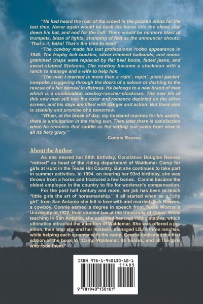 This is the loving story of Constance Douglas Reeves and her husband, Jack Reeves. He was a rodeo cowboy and rancher, while she was a stable owner, riding instructor and wife. Together they managed ranches for Lyndon Baines Johnson and she spent more than a half-century teaching girls horsemanship at Waldemar Camp. The Depression ruined Connie's plans to practice law. Instead, in 1936, she joined the staff at Waldemar as head riding instructor and continued in that capacity for over sixty years. She touched the lives of thousands of young women as a role model and a mentor. Connie married in 1942 and with her husband managed a 10,000 plus acre ranch for more than forty years. In 1997 she was inducted into the National Cowgirl Hall of Fame.