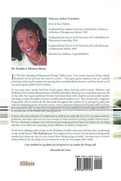 In "The New Meaning of Educational Change" Fullen wrote, "Low morale, depressed, feeling unfairly blamed for the ills of society? You must be a teacher." This quote spoke volumes to me as I watched politicians jockeying for position by spewing their recycled political rhetoric, and then launch an all out attack against public school teachers. In years past these attacks had been levied against those receiving social security, Medicare and Medicaid which mainly affected the poor, disabled and elderly. Don't get me wrong these issues are still on the table, but I guess politicians felt they had beaten them with a dead horse and needed another soft target to spark the public's interest so public school teachers was it. They struck with a vengeance firing public school teachers by the thousands throughout the country. In an attempt to reduce the collective bargaining power of teacher unions, such as American Federation of Teacher (AFT) in Texas they claimed the only way they knew to help balance the state and district school budget shortfalls was to rescind some of the benefits they had agreed too. It hurts when the profession I've dedicated over half of my adult life (25 yrs.) to; is under attack by politicians and other's that have no true concept of what's involved in being a public school teacher. We have absolutely nothing to do with the decision making process. First we're told to do one thing and then we're told to do something entirely different. It's almost schizophrenic. To all of my colleagues that remain on the frontlines of public education and those that are planning to take up the banner 'This book's for you.' You might not have control over the decisions being made outside your classroom, but you can control those things going on inside. I provide ways to control student behavior by the design of your classroom to the use of a simple yellow tablet.