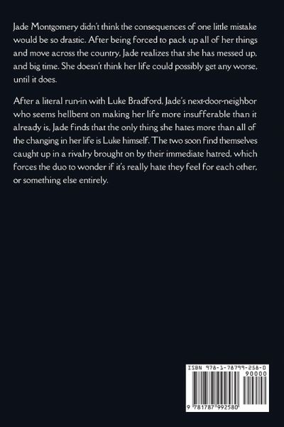 Jade Montgomery didn't think the consequences of one little mistake would be so drastic. After being forced to pack up all of her things and move across the country, Jade realizes that she has messed up, and big time. She doesn't think her life could possibly get any worse, until it does. After a literal run-in with Luke Bradford, Jade's next-door-neighbor who seems hellbent on making her life more insufferable than it already is, Jade finds that the only thing she hates more than all of the changing in her life is Luke himself. The two soon find themselves caught up in a rivalry brought on by their immediate hatred, which forces the duo to wonder if it's really hate they feel for each other, or something else entirely.