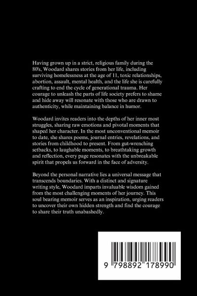 Having grown up in a strict, religious family during the 80's, Woodard shares stories from her life, including surviving homelessness at the age of 11, toxic relationships, abortion, assault, mental health, and the life she is carefully crafting to end the cycle of generational trauma. Her courage to unleash the parts of life society prefers to shame and hide away will resonate with those who are drawn to authenticity, while maintaining balance in humor. Woodard invites readers into the depths of her inner most struggles, sharing raw emotions and pivotal moments that shaped her character. In the most unconventional memoir to date, she shares poems, journal entries, revelations, and stories from childhood to present. From gut-wrenching setbacks, to laughable moments, to breathtaking growth and reflection, every page resonates with the unbreakable spirit that propels us forward in the face of adversity. Beyond the personal narrative lies a universal message that transcends boundaries. With a distinct and signature writing style, Woodard imparts invaluable wisdom gained from the most challenging moments of her journey. This soul bearing memoir serves as an inspiration, urging readers to uncover their own hidden strength and find the courage to share their truth unabashedly.