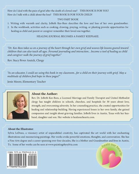 I Miss Tea Time with Grandma, a children's story with activities about grief and healing! Introduction includes a letter to parent and a letter to child from the author. Part 1, the story, describes the relationship between the author and her grandma. Part 2, the journal, involves activities for child and caregiver to do together. Activities such as cooking a favorite meal, planting their favorite flowers, writing a letter, coloring, talking with a trusted adult, praying, picking strawberries or pumpkins offer opportunities for child and caregiver to remember their loved one who died. Writing and coloring in the journal about shared activities, the child and caregiver create a memory book about their loved one!