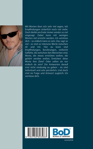 Mit Worten lässt sich sehr viel sagen, mit Empfindungen sicherlich noch viel mehr. Doch bleibt am Ende immer wieder so viel ungesagt. Dabei kann mit wenigen Worten viel erreicht werden. Ich vermisse dich - so einfach kann es sein. Das sagt so viel - es sind so intensive Worte zwischen dir und mir. Hier zu lesen sind Empfindungen, Berührungen, vielleicht Gefühle, die zwischen den Menschen sind, Worte, die etwas erreichen wollen, die gehört werden wollen. Erreichen diese Worte ihre Ziele? Oder sollen sie nur einfach da sein? Die Antworten darauf sind nicht eindeutig zu geben - sie sind individuell und sehr persönlich. Und doch sind sie Frage und Antwort zugleich: Ich vermisse dich.