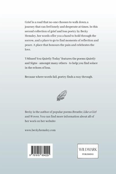 Grief is a road that no-one chooses to walk down; a journey that can feel lonely and desperate at times. In this second collection of grief and loss poetry by Becky Hemsley, her words offer you a hand to hold through the sorrow, and a place to go to find moments of reflection and peace. A place that honours the pain and celebrates the love. 'I Missed You Quietly Today' features the poems Quietly and Signs - amongst many others - to help you find solace in the echoes of loss. Because where words alone fail, poetry finds a way through. Becky is the author of popular poems Breathe, Like a Girl and Woven. You can find more information about all of her work on her website: beckyhemsley.com