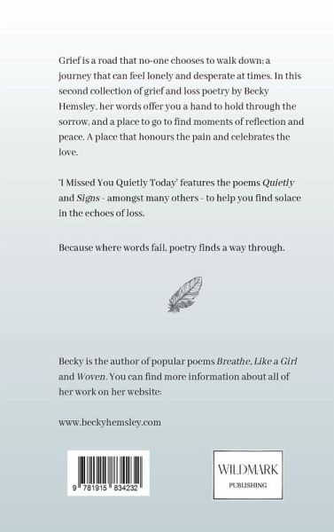 Grief is a road that no-one chooses to walk down; a journey that can feel lonely and desperate at times. In this second collection of grief and loss poetry by Becky Hemsley, her words offer you a hand to hold through the sorrow, and a place to go to find moments of reflection and peace. A place that honours the pain and celebrates the love. 'I Missed You Quietly Today' features the poems Quietly and Signs - amongst many others - to help you find solace in the echoes of loss. Because where words fail, poetry finds a way through. Becky is the author of popular poems Breathe, Like a Girl and Woven. You can find more information about all of her work on her website: beckyhemsley.com