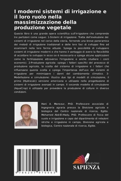 Questo libro è una grande opera scientifica sull'irrigazione che comprende tre partizioni come segue: 1-Sistemi di irrigazione: Tratta dell'evoluzione dei sistemi di irrigazione nel corso della storia, fornendo una breve panoramica dei metodi di irrigazione tradizionali e delle loro fasi di sviluppo fino ad esaminarli nella loro forma attuale. Spiega la possibilità di sviluppare sistemi di irrigazione moderni e che hanno il vantaggio di avere la flessibilità di accettare lo sviluppo in esso se è necessario e spiega alcune applicazioni come la fertilizzazione attraverso l'irrigazione e anche studiare i costi economici. 2-Produzione agricola: spiega i fattori specifici del processo di produzione agricola, la scelta del sistema di irrigazione e i fattori che influenzano questa scelta e spiega l'importanza dell'uso dei sistemi di irrigazione per minimizzare i danni del cambiamento climatico. 3- Modellazione e simulazione: illustra due tipi di modelli di simulazione, il primo (Hydrocalc) versione americana e utilizzato nella progettazione di sistemi di irrigazione avanzati in campo. Il secondo modello di simulazione (AquaCrop) è utilizzato per prevedere la produzione di colture in diverse condizioni.