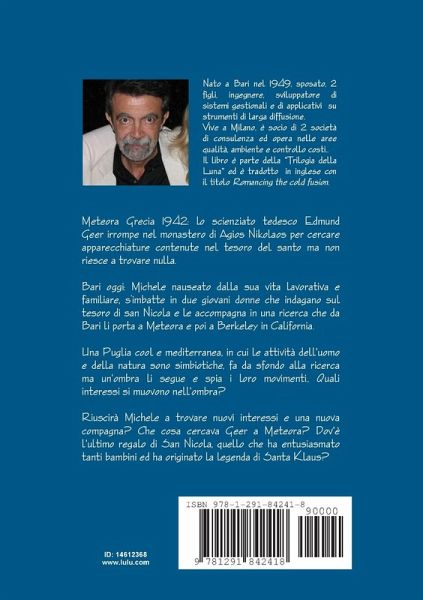 Meteora Grecia 1942 : lo scienziato tedesco Edmung Geer irrompe nel monastero di Agios Nikolaos per cercare apparecchiature contenute nel tesoro del santo ma non trova nulla. Bari oggi : Michele, nauseato dalla sua vita lavorativa e familiare, si imbatte in due giovani donne che indagano sul tesoro di san Nicola e le accompagna in una ricerca che da Bari li porta a Meteora ed all'area 51 in Nevada. Una puglia cool e mediterranea in cui le attività dell'uomo e della natura sono simbiotiche, fa da sfondo alla ricerca ma un'ombra li segue e spia i loro movimenti. Quali interessi si muovono nell'ombra? Riuscirà Michele a trovare nuovi interessi ed una nuova compagna? Cosa cercava Geer a Meteora nel 1942? Dov'è l'ultimo regalo di san Nicola, quello che ha entusiasmato tanti bambini ed ha originato la legenda di Santa Klaus?