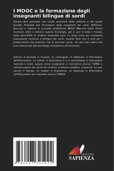 Questo libro presenta uno studio esaustivo delle politiche e dei quadri giuridici finalizzati alla formazione degli insegnanti dei sordi. Definisce, descrive e registra le principali piattaforme MOOC (Massive Open Online Courses), oltre a indicare questa tecnologia, già in uso in tutto il mondo, come possibilità di rendere disponibili corsi su larga scala per sostenere l'educazione inclusiva e bilingue dei sordi. Questo libro non è solo per i professionisti che lavorano con le persone sorde, ma per tutti coloro che sono interessati alle tecnologie innovative e all'inclusione.