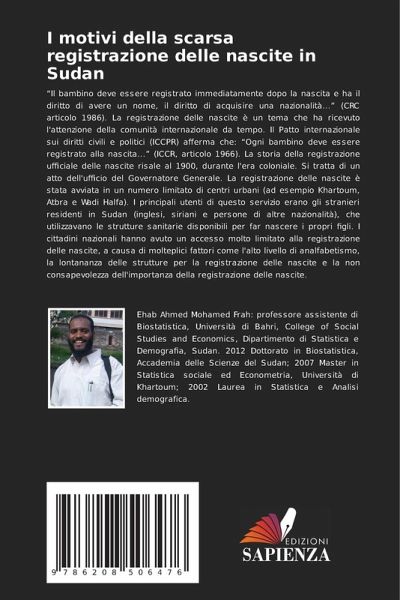 "Il bambino deve essere registrato immediatamente dopo la nascita e ha il diritto di avere un nome, il diritto di acquisire una nazionalità..." (CRC articolo 1986). La registrazione delle nascite è un tema che ha ricevuto l'attenzione della comunità internazionale da tempo. Il Patto internazionale sui diritti civili e politici (ICCPR) afferma che: "Ogni bambino deve essere registrato alla nascita..." (ICCR, articolo 1966). La storia della registrazione ufficiale delle nascite risale al 1900, durante l'era coloniale. Si tratta di un atto dell'ufficio del Governatore Generale. La registrazione delle nascite è stata avviata in un numero limitato di centri urbani (ad esempio Khartoum, Atbra e Wadi Halfa). I principali utenti di questo servizio erano gli stranieri residenti in Sudan (inglesi, siriani e persone di altre nazionalità), che utilizzavano le strutture sanitarie disponibili per far nascere i propri figli. I cittadini nazionali hanno avuto un accesso molto limitato alla registrazione delle nascite, a causa di molteplici fattori come l'alto livello di analfabetismo, la lontananza delle strutture per la registrazione delle nascite e la non consapevolezza dell'importanza della registrazione delle nascite.