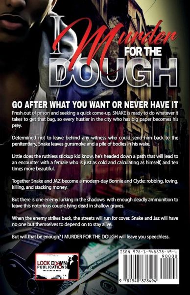 Fresh out of prison and seeking a quick come-up, SNAKE is ready to do whatever it takes to get that bag, so every hustler in the city who has big paper becomes his prey. Determined not to leave behind any witness who could send him back to the penitentiary, Snake leaves gunsmoke and a pile of bodies in his wake. Little does the ruthless stickup kid know, he's headed down a path that will lead to an encounter with a female who is just as cold and calculating as himself, and ten times more beautiful. Together Snake and JAZ become a modern-day Bonnie and Clyde: robbing, loving, killing, and stacking money. But there is one enemy lurking in the shadows with enough deadly ammunition to leave this notorious couple lying dead in shallow graves. When the enemy strikes back, the streets will run for cover. Snake and Jaz will have no one but themselves to depend on to stay alive. But will that be enough? I MURDER FOR THE DOUGH will leave you speechless.