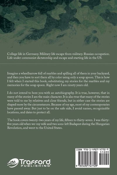 Imagine a wheelbarrow full of marbles and spilling all of them in your backyard, and then you have to sort them all by color using only a soup spoon. This is how I felt when I started this book, substituting my stories for the marbles and my memories for the soup spoon. Right now I am ninety years old. I do not intend to bore you with an autobiography. It is true, however, that in many of the stories I am the main character. It is also true that many of the stories were told to me by relatives and close friends, but in either case the stories are shaped more by the circumstances. Because of my age, most of my contemporaries have passed away. But just to be on the safe side, I avoid names, recognizable locations, and dates to protect all. The book covers twenty-two years of my life, fifteen to thirty-seven. I was thirty-five years old when we-my wife and two sons-left Budapest during the Hungarian Revolution, and went to the United States.
