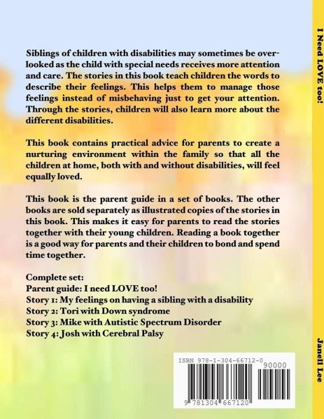 Siblings of children with disabilities may sometimes be overlooked as the child with special needs receives more attention and care. The stories in this book teach children the words to describe their feelings. This helps them to manage those feelings instead of misbehaving just to get your attention. Through the stories, children will also learn more about the different disabilities. This book contains practical advice for parents to create a nurturing environment within the family, so that all the children at home, both with and without disabilities, will feel equally loved. This book is the parent guide in a set of 5 books. The other books are sold separately as illustrated copies of the stories in this book. This makes it easy for parents to read the stories together with their young children. Reading a book together is a good way for parents and their children to bond and spend quality time together.