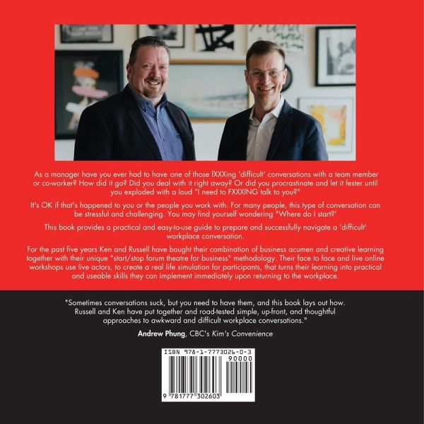 This book provides a practical and easy-to-use guide to prepare and successfully navigate a 'difficult' workplace conversations. For the past five years Ken and Russell have bought their combination of business acumen and creative learning together with their unique "start/stop forum theatre for business" methodology. Their face to face and live online workshops use live actors, to create a real life simulation for participants, that turns their learning into practical and useable skills they can implement immediately upon returning to the workplace.