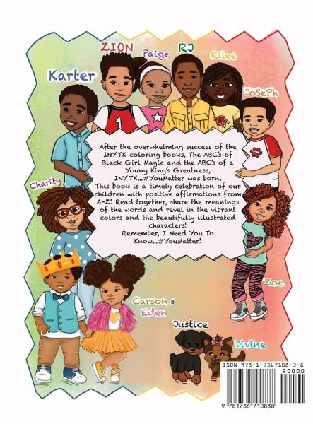 After the overwhelming success of the INYTK coloring books, The ABC's of Black Girl Magic and The ABC's of a Young King's Greatness, INYTK...#You Matter was born. This book is a timely celebration of our children with positive affirmations from A-Z! Read together, share the meanings of the words and revel in the vibrant colors and the beautifully illustrated characters! Remember, I Need You To Know...#You Matter!