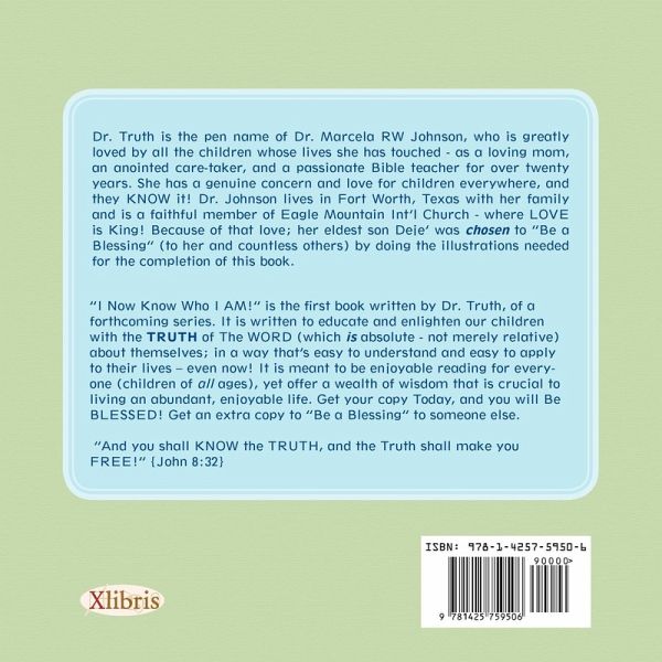 "I Now Know Who I AM!" is the first book written by Dr. Truth, of a forthcoming series. It is written to educate and enlighten our children with the TRUTH of The WORD (which is absolute - not merely relative) about themselves; in a way that's easy to understand and easy to apply to their lives - even now! It is meant to be enjoyable reading for everyone (children of all ages), yet offer a wealth of wisdom that is crucial to living an abundant, enjoyable life. Get your copy Today, and you will Be BLESSED! Get an extra copy to "Be a Blessing" to someone else. "And you shall KNOW the TRUTH, and the Truth shall make you FREE!" {John 8:32}