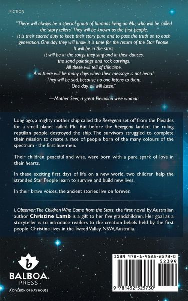 "There will always be a special group of humans living on Mu, who will be called the 'story tellers'. They will be known as the first people. It is their sacred duty to keep their story pure and to pass the truth on to each generation. One day they will know it is time for the return of the Star People. It will be in the stars. It will be in the songs they sing and in their dances, the sand paintings and rock carvings. All these will tell of this time. And there will be many days when their message is not heard. They will be sad, because no one listens to them. One day, all will listen." -Mother Seer, a great Pleiadian wise woman Long ago, a mighty mother ship called the Rexegena set off from the Pleiades for a small planet called Mu. But before the Rexegena landed, the ruling reptilian people destroyed the ship. The survivors struggled to complete their mission to create a race of people born of the many colours of the spectrum - the first hue-men. Their children, peaceful and wise, were born with a pure spark of love in their hearts. In these exciting first days of life on a new world, two children help the stranded Star People learn to survive and build new lives. In their brave voices, the ancient stories live on forever.