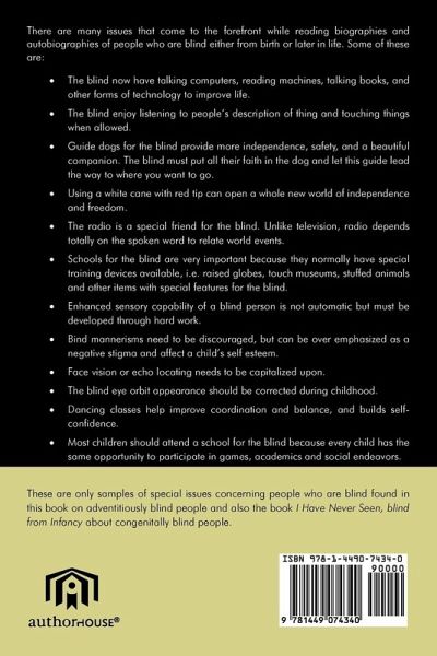 There are many issues that come to the forefront while reading biographies and autobiographies of people who are blind either from birth or later in life. Some of these are: · The blind now have talking computers, reading machines, talking books, and other forms of technology to improve life. · The blind enjoy listening to people's description of thing and touching things when allowed. · Guide dogs for the blind provide more independence, safety, and a beautiful companion. The blind must put all their faith in the dog and let this guide lead the way to where you want to go. · Using a white cane with red tip can open a whole new world of independence and freedom. · The radio is a special friend for the blind. Unlike television, radio depends totally on the spoken word to relate world events. · Schools for the blind are very important because they normally have special training devices available, i.e. raised globes, touch museums, stuffed animals and other items with special features for the blind. · Enhanced sensory capability of a blind person is not automatic but must be developed through hard work. · Bind mannerisms need to be discouraged, but can be over emphasized as a negative stigma and affect a child's self esteem. · Face vision or echo locating needs to be capitalized upon. · The blind eye orbit appearance should be corrected during childhood. · Dancing classes help improve coordination and balance, and builds self- confidence. · Most children should attend a school for the blind because every child has the same opportunity to participate in games, academics and social endeavors. These are only samples of special issues concerning people who are blind found in this book on adventitiously blind people and also the book I Have Never Seen, blind from Infancy about congenitally blind people.