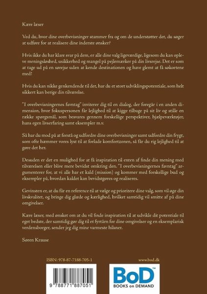 Kære læser Ved du, hvor dine overbevisninger stammer fra og om de understøtter det, du søger at udføre for at realisere dine inderste ønsker? Hvis ikke du har klare svar på dem, er alle dine valg ligeværdige, ligesom du kan opleve meningsløshed, usikkerhed og mangel på pejlemærker på din livsrejse. Det er som at tage ud på en sørejse uden at kende destinationen og have glemt at få søkortene med! Hvis du kan nikke genkendende til det, har du et stort udviklingspotentiale, som helt sikkert kan berige din tilværelse. "I overbevisningernes favntag" inviterer dig til en dialog, der foregår i en anden dimension, hvor fokuspersonen får lejlighed til at kigge tilbage på sit liv og stille en række spørgsmål, som besvares gennem forskellige perspektiver, hjælpeværktøjer, hans egen livserfaring samt eksempler m.v. Så har du mod på at forstå og udfordre dine overbevisninger samt udfordre din frygt, som ofte hæmmer vores lyst til at forlade komfortzonen, så får du rig lejlighed til at gøre det her. Desuden er det en mulighed for at få inspiration til enten af finde din mening med tilværelsen eller blive mere bevidst omkring den. "I overbevisningernes favntag" argumenterer for, at vi alle har et kald (mission) og kommer med forskellige bud og eksempler på, hvordan kaldet kan bevidstgøres og realiseres. Gevinsten er, at du får en reference til at vælge og prioritere dine valg, som vil øge din livskvalitet, og bringe dig glæde og kærlighed, hvilket samtidig vil smitte af på dine omgivelser. Kære læser, med ønsket om at du vil finde inspiration til at udvikle dit potentiale til eget bedste, der samtidig gør dig til et fyrtårn for dine omgivelser og en eksemplarisk verdensborger, sender jeg dig mine varmeste hilsner. Søren Krause