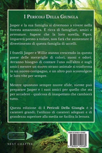 Jasper e la sua famiglia si divertono a vivere nella foresta amazzonica. È ricca di famigliari, amici e avventure. Sapere che la loro sorella, Piper, imparerà presto a volare, non farà che aumentare il divertimento di questa famiglia di uccelli. I fratelli Jasper e Willie stanno crescendo in questo paese delle meraviglie di colori, suoni e odori. Avranno bisogno di contare l'uno sull'altro e sugli amici mentre un nuovo strano animale si trasforma in un nuovo compagno, e un altro può sconvolgere le loro vite per sempre. Mentre spuntano sempre nuove sfide, niente può preparare Jasper e i suoi amici per quello che sta per accadere - qualcosa di inaspettato che cambierà tutto. Edizione A Caratteri Grandi