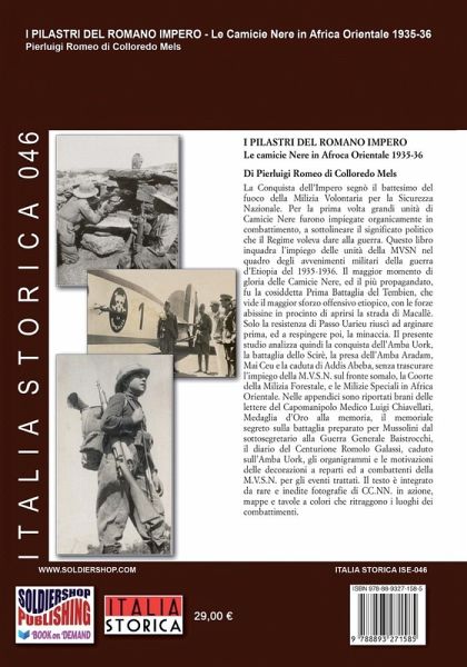 La Conquista dell’Impero segnò il battesimo del fuoco della Milizia Volontaria per la Sicurezza Nazionale. Per la prima volta grandi unità di Camicie Nere furono impiegate organicamente in combattimento, a sottolineare il significato politico che il Regime voleva dare alla guerra. Questo libro inquadra l’impiego delle unità della MVSN nel quadro degli avvenimenti militari della guerra d’Etiopia del 1935-1936. Il maggior momento di gloria delle Camicie Nere, ed il più propagandato, fu la cosiddetta Prima Battaglia del Tembien, che vide il maggior sforzo offensivo etiopico, con le forze abissine in procinto di aprirsi la strada di Macallè. Solo la resistenza di Passo Uarieu riuscì ad arginare prima, ed a respingere poi, la minaccia. Il presente studio analizza quindi la conquista dell’Amba Uork, la battaglia dello Scirè, la presa dell’Amba Aradam, Mai Ceu e la caduta di Addis Abeba, senza trascurare l’impiego della M.V.S.N. sul fronte somalo, la Coorte della Milizia Forestale, e le Milizie Speciali in Africa Orientale. Nelle appendici sono riportati brani delle lettere del Capomanipolo Medico Luigi Chiavellati, Medaglia d’Oro alla memoria, il memoriale segreto sulla battaglia preparato per Mussolini dal sottosegretario alla Guerra Generale Baistrocchi, il diario del Centurione Romolo Galassi, caduto sull’Amba Uork, gli organigrammi e le motivazioni delle decorazioni a reparti ed a combattenti della M.V.S.N. per gli eventi trattati. Il testo è integrato da rare e inedite fotografie di CC.NN. in azione, mappe e tavole a colori che ritraggono i luoghi dei combattimenti.