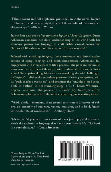 In her first new book of poetry since Jaguar of Sweet Laughter, poet and naturalist Diane Ackerman combines her deep understanding of the world with her immense passion for language to craft richly sensual poems that "honor all life/wherever and in whatever form/it may deal." Imbued with ravishing imagery, these exuberant and lyrical explorations of aging, longing, and death demonstrate Ackerman's full engagement with every aspect of life's process. Ackerman muses on the confines of therapy sessions, where she intersects "twice a week/in a painstaking hide-and-seek/making do with half-light, half-speak"; relishes the succulent pleasure of eating an apricot, with its "gush of taboo sweetness"; and imagines the "unupholstered voice, a life in outline" in her stunning elegy to C. S. Lewis. Whimsical, organic, and wise, the poems in I Praise My Destroyer affirm Ackerman's place as one of the most enchanting poets writing today.