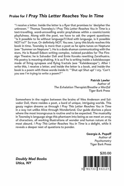Thomas Townsley's fourth book I Pray This Letter Reaches You In Time is his best yet. A master of subterfuge and elision, his poems are full of "erotic prayfulness within a cosmic/comic playfulness" (Patrick Lawler). Townsley "diarizes a place where the most incongruous is routine and to be expected" (Georgia A. Popoff).